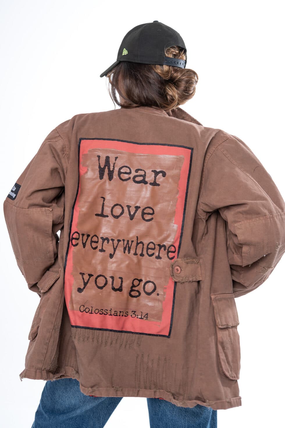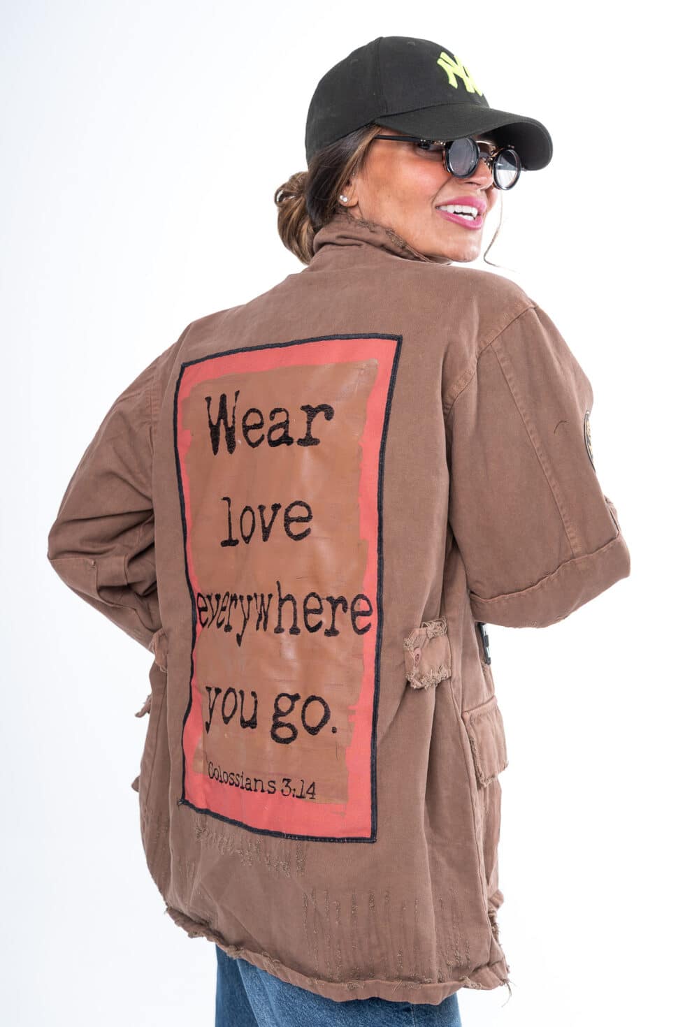 Χειροποίητο τζάκετ με funky διακοσμητικά patches, γιακά και τσέπες. Έχει χαλαρή, ίσια γραμμή.