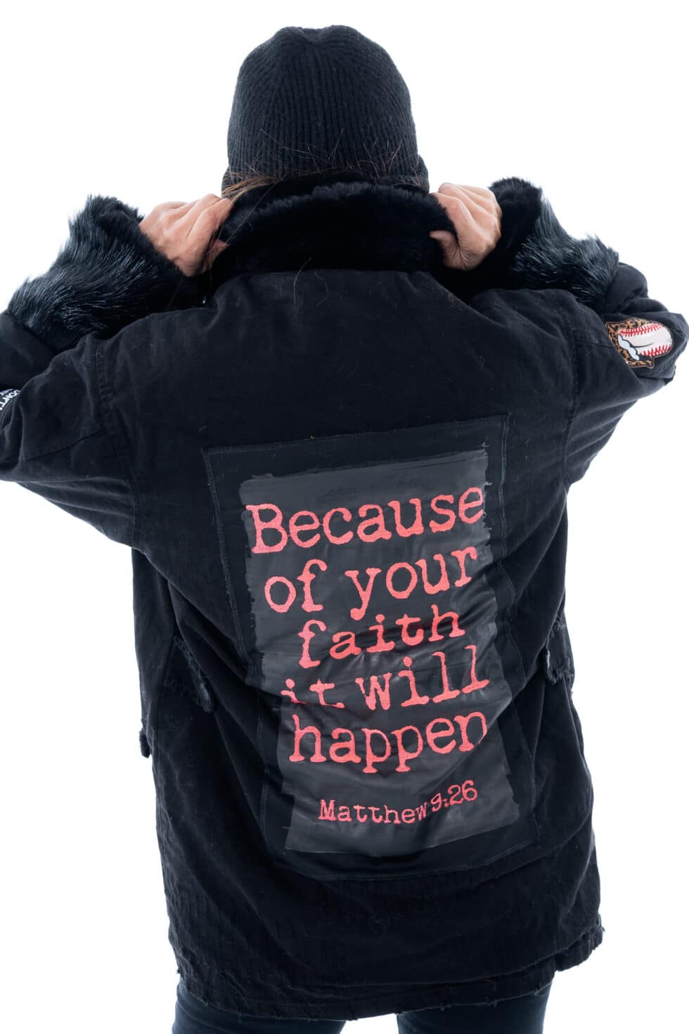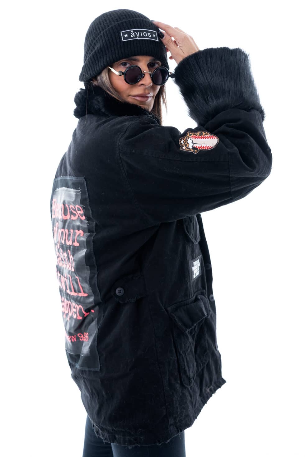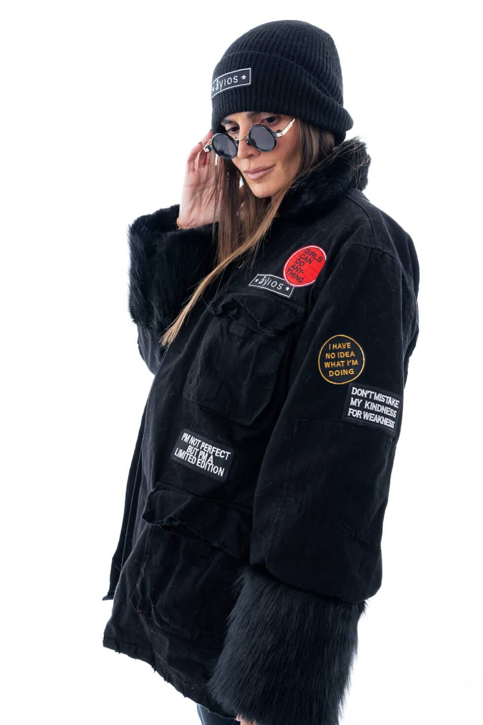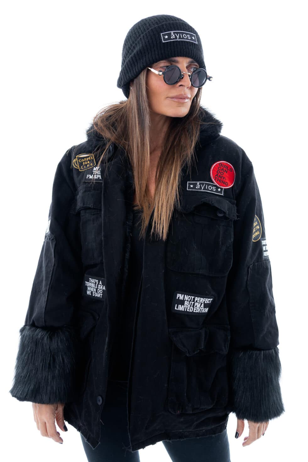 Χειροποίητο τζάκετ με funky διακοσμητικά patches, γιακά και τσέπες. Έχει χαλαρή, ίσια γραμμή.
